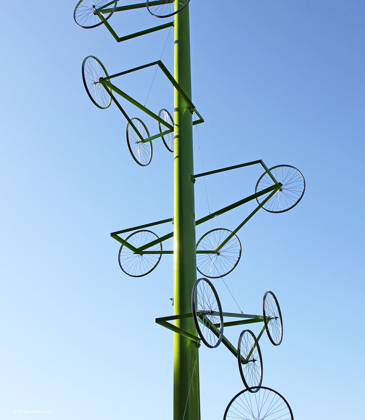L’Exposition à Kanaz Forest of Creation en automne-hiver 2011 a réuni tous les éléments du projet « Air en péril », pour la première fois depuis sa conception 7 ans et demi plus tôt. C’était aussi l’occasion de la première réalisation de « Roue aérienne ». Les conditions environnementales de Kanaz m’ont incité à introduire une forme linéaire dans la « Roue aérienne ». Elle rappelle le trajet rectiligne des photons qui permettent l’existence de la photosynthèse, de la chlorophylle, des forêts. La dimension de la « Roue aérienne » est calculée par rapport à l’espace offert, et la couleur verte est choisie par rapport à l’environnement.