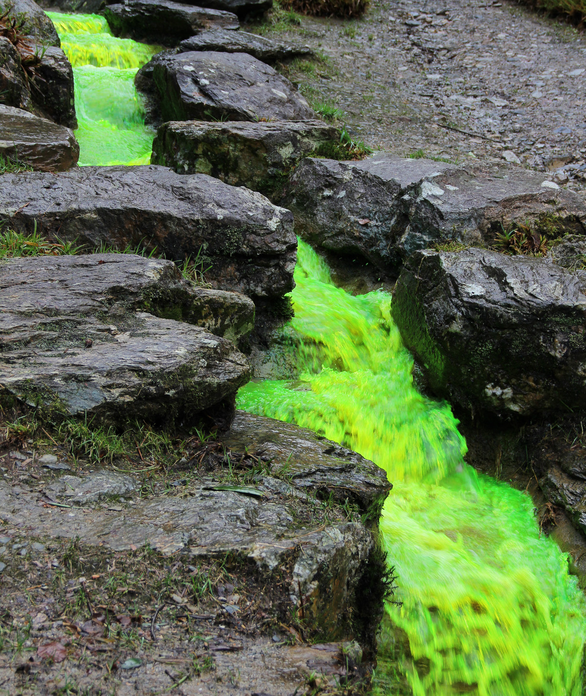パフォーマンス「水を追いかける」はプロジェクト「ウォーター・フットプリント」の一部。フランス人一人が一年に消費する水は1800トン。同量の貯水池の水をフリューオレセインで染めバルブを開けて領地に流すパフォーマンスは、6か月の展覧会中、4回行われた。