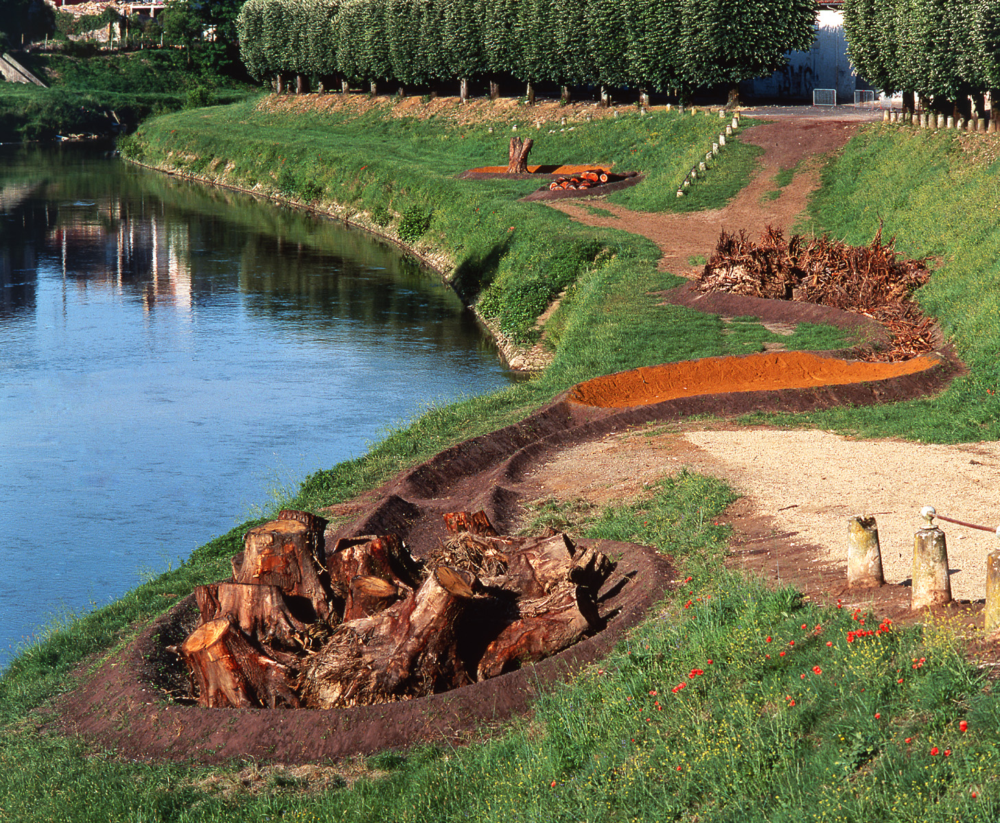 J’ai visité Mont-de-Marsan lors du repérage du lieu d’une intervention artistique, six mois avant l’intervention. A cette époque, mon père avait un cancer en phase terminale, et séjournait dans un hopital au Japon. Il est mort à peine deux semaines après mon repérage. J’étais sous le coup de cet événement bouleversant, et divers éléments du paysage de Mont-de-Marsan me sont revenu en mémoire avec une coloration symbolique très particulière et poignante. La rivière qui sépare la ville en deux, le quai désaffecté et abandonné, des tilleuls plantés en ligne sur des centaines de mètre…, tous ces éléments peuvent évoquer la mort chez les bouddhistes. (Çakyamuni a atteint à l’illumination sous un tilleul indien. Il méditait jusqu’à la fin de sa vie sous ce tilleul. “Tilleul” se dit Bodaï-ju en japonais, et on utilise ce même mot Bodaï pour signifier “devenir bouddha dans l’au-delà”.) Je ne suis pas du tout pratiquante, mais cette manière spontanée d’interpréter les élements du paysage m’a révélé à quel point j’étais encore imprégnée d’idées bouddhistes. Ainsi, sur le quai Silguy sous des tilleuls, j’ai réalisé une oeuvre intitulée « Arbre Généalogique / Mort » de 130m de long, en rassemblant environ 30t de racines, de souches, et de billes de bois. L’installation de Mort est située l’au de là de la rivière. La rivière qui symbolise la frontière de ce monde.