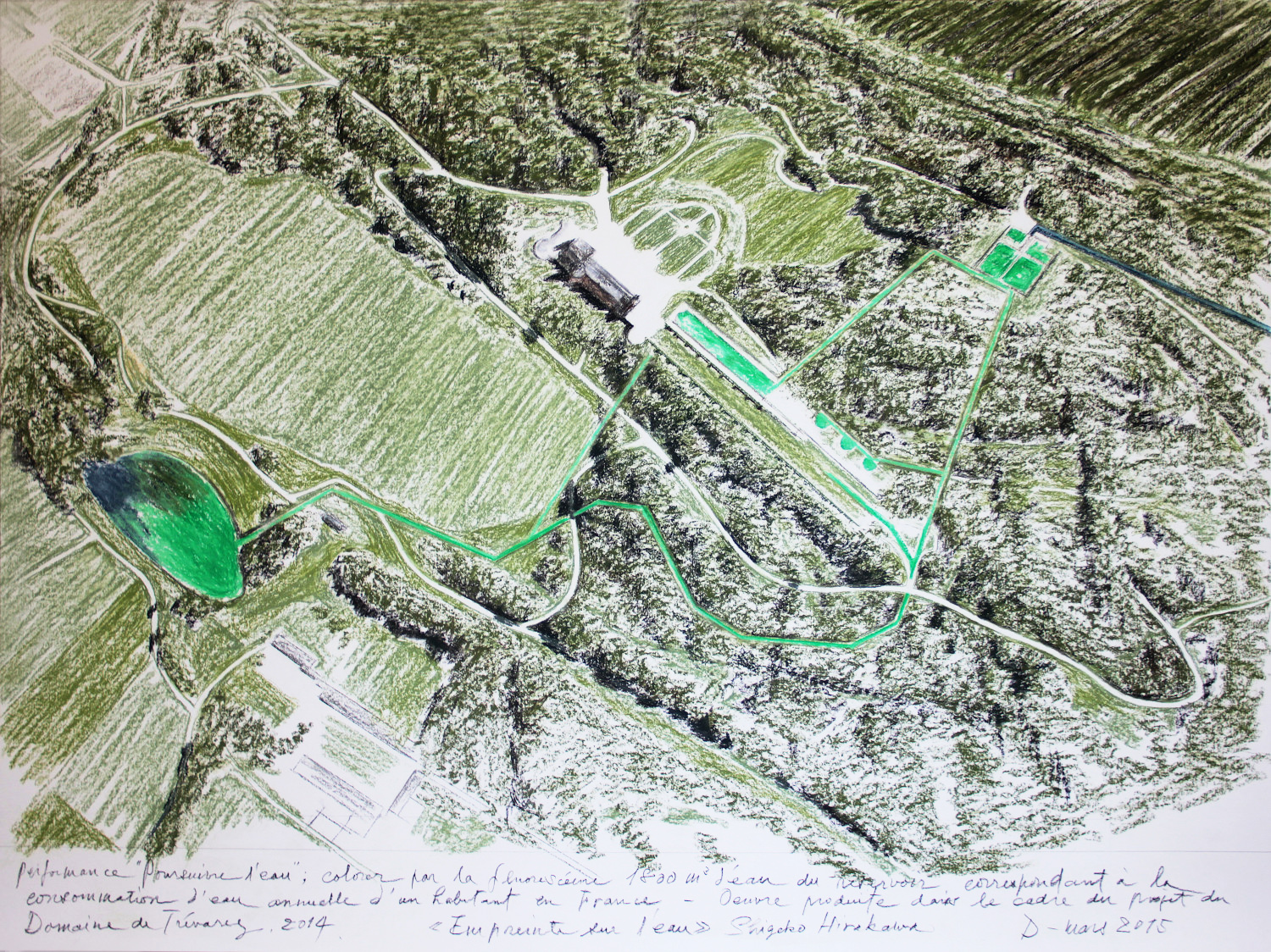 *衣服、食物、電気、運送など生活に必要なものに使われている水の総体は計算で出せるが目に見えないためにバーチャル・ウォーターとよばれ、またエコロジー用語ではウォーター・フットプリントと呼ばれる。ユネスコの報告書によれば、一年間にフランス人一人が使う水の量は約1800トン。パフォーマンスは、ちょうど1800トンの水をためる貯水池の水を利用して行った。プロジェクト「ウォーター・フットプリント」の一環。