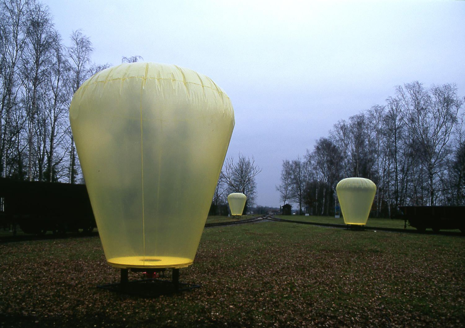 Le concept de l’installation « Air, Poumon » est né quand j’ai pris conscience du travail dangereux des mineurs dans les houillères. Trois ballons, faits de bâches agricoles soudées, se gonflent d’air ambiant sous l’action de ventilateurs installés sous chacun des ballons.