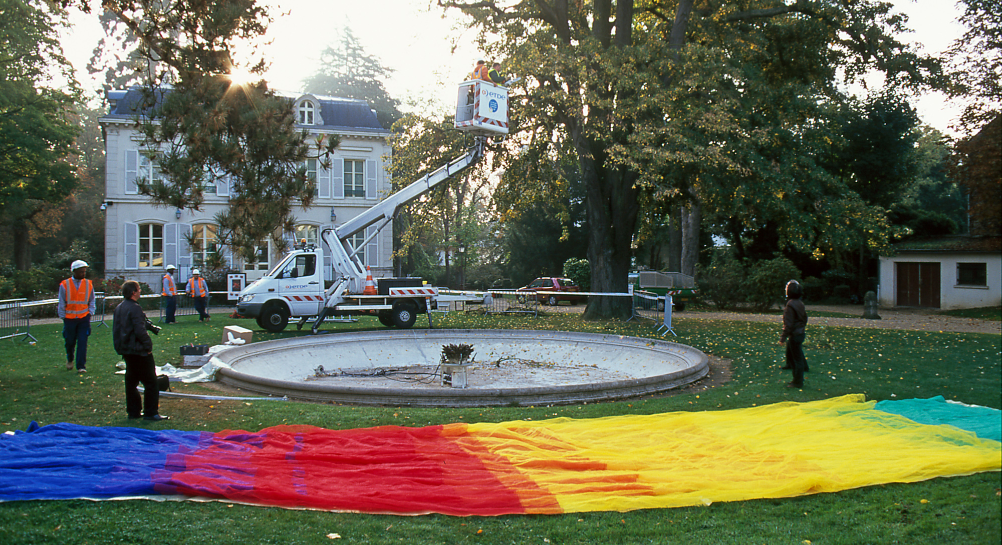 12 mètres de haut, 3 mètres de diamètre, tissus techniques, aluminium.
